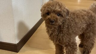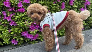 あんことゆかいな仲間たち(日記) – 2026.4.18 ㈯ – ベンチに乗せられ、きょとん…🐶 『え?また今日もお花と撮るんでつか?🐶』 いいね、いいね!かわいいよー!📸🥹アリガトー♡ (function(b,c,f,g,a,d,e){...