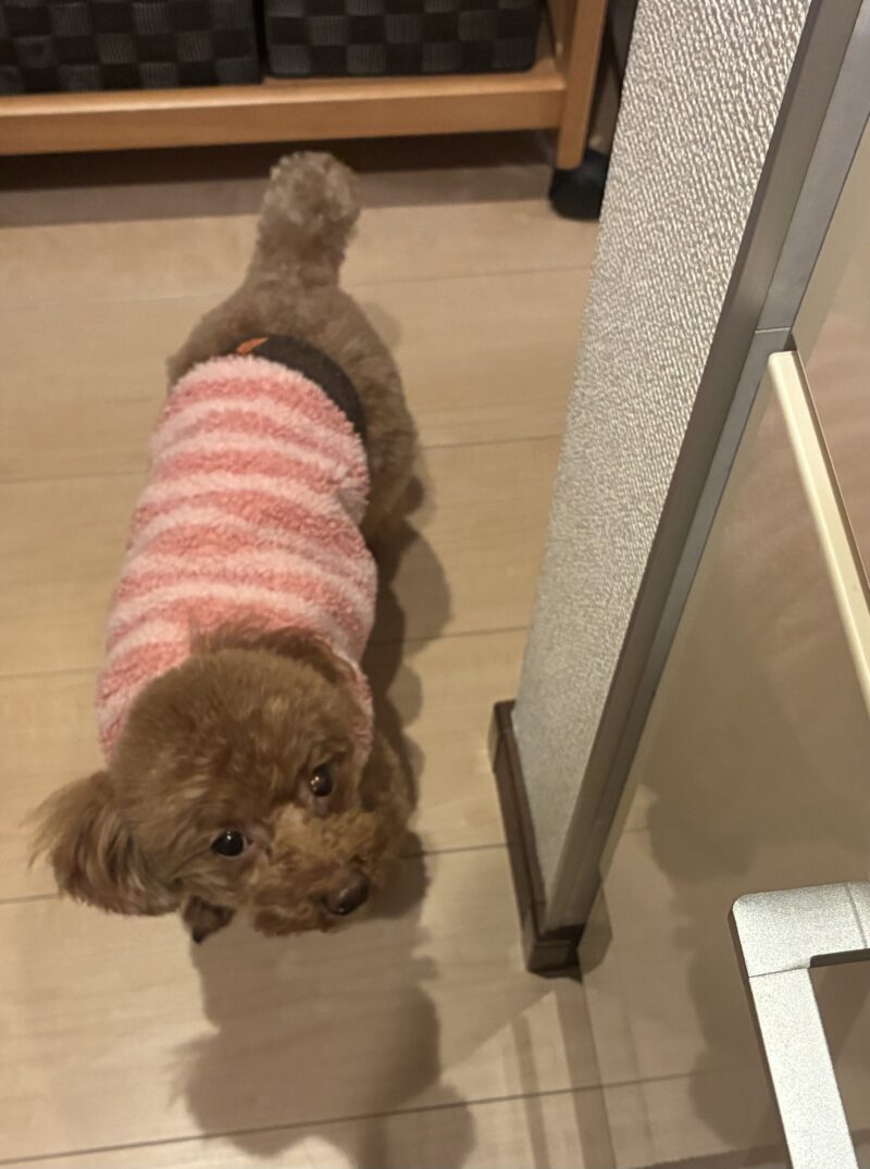 最近は眠いのに寝る準備(パジャマ着てサークル入る)しなかったら何度もキッチン見にくるんです🐶