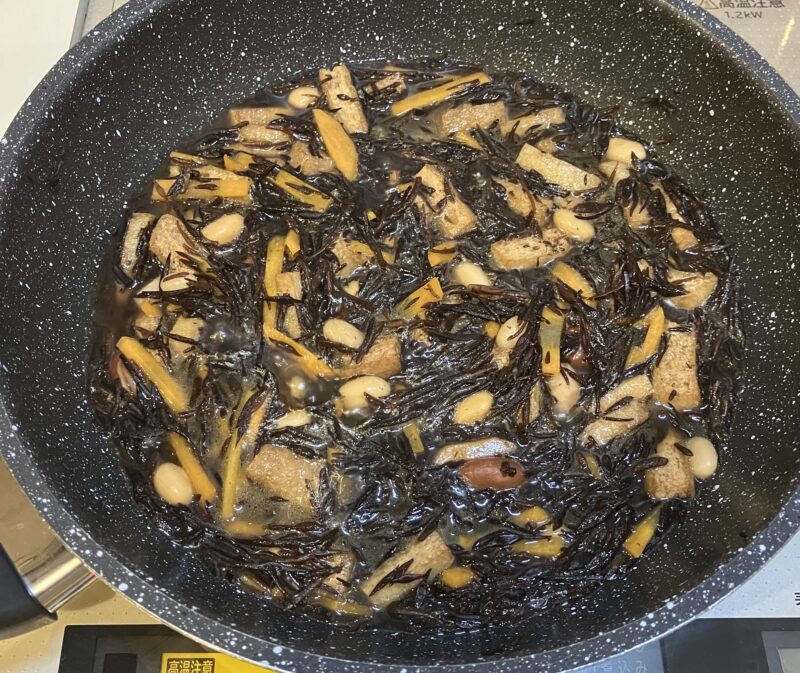 ③ひじきをごま油で強火で炒め、人参、まめ、おあげを加えてさらに炒める