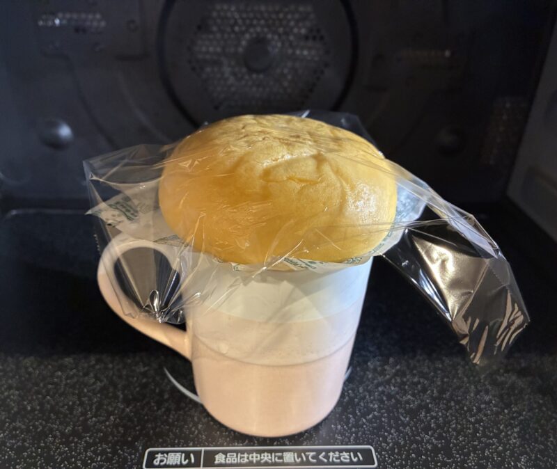 『マグカップに水を1~2㎝入れ敷き紙をつけたままカップの上にフタをするように肉まんをのせラップをふんわりして電子レンジ(600W)2分温め。』